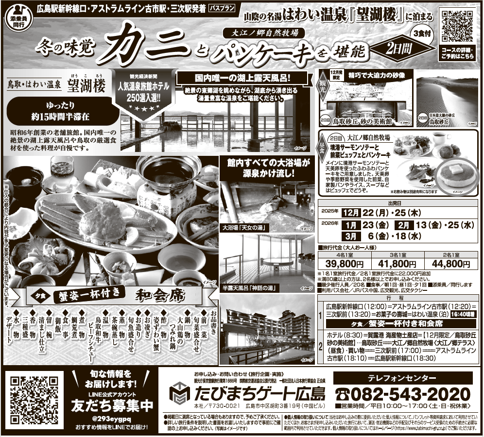 1月~3月出発 はわい温泉「望湖楼」に泊まる~カニ会席を堪能 2日間